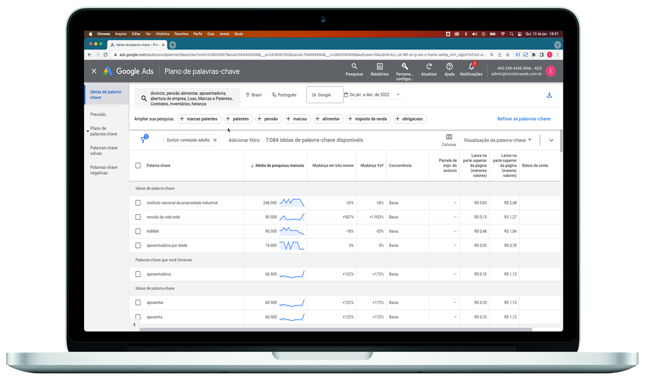 Composta por Palavras Chaves, Tags de Conversões, segmentações de perfil, criamos os Anúncios para publicar na Rede de Pesquisa e Display, inclusive criando Artes Digitais para aumentar a visibilidade.